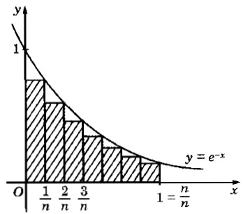 Một hình phẳng được giới hạn bởi \(\displaystyle  y = {e^{ – x}},y = 0,x = 0,x = 1\). Ta chia đoạn \(\displaystyle  \left[ {0;1} \right]\) thành \(\displaystyle  n\) phần bằng nhau tạo thành một hình bậc thang (bởi \(\displaystyle  n\) hình chữ nhật con như dưới).
