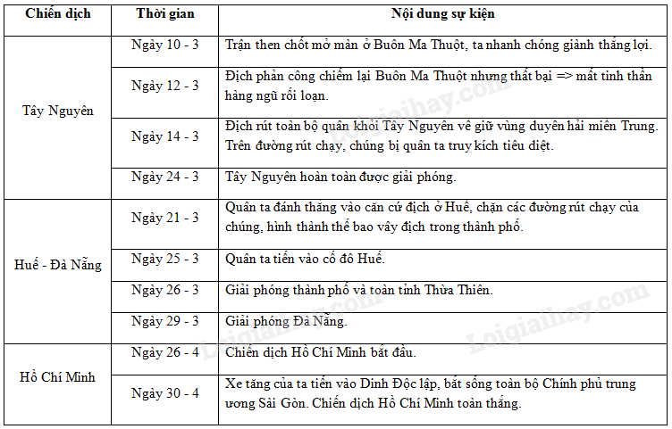 Điền các nội dung sự kiện cho phù hợp với mốc thời gian trong bảng dưới đây về diễn biến cuộc Tổng tiến công và nổi dậy Xuân 1975.