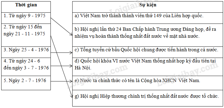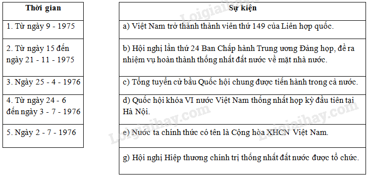 Hãy nối thời gian với nội dung sự kiện trong bảng dưới đây cho phù hợp về quá trình khắc phục hậu quả chiến tranh, khôi phục kinh tế – xã hội và hoàn thành thống nhất nước về mặt nhà nước (1975 – 1976)
