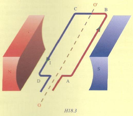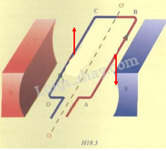 Một khung dây dẫn ABCD có dòng điện chạy qua đặt trong từ trường của một nam châm. Khung dây có thể quay quanh trục đối xứng OO’ nằm ngang. Khi khung dây ở vị trí được mô tả như trên hình H18.3: