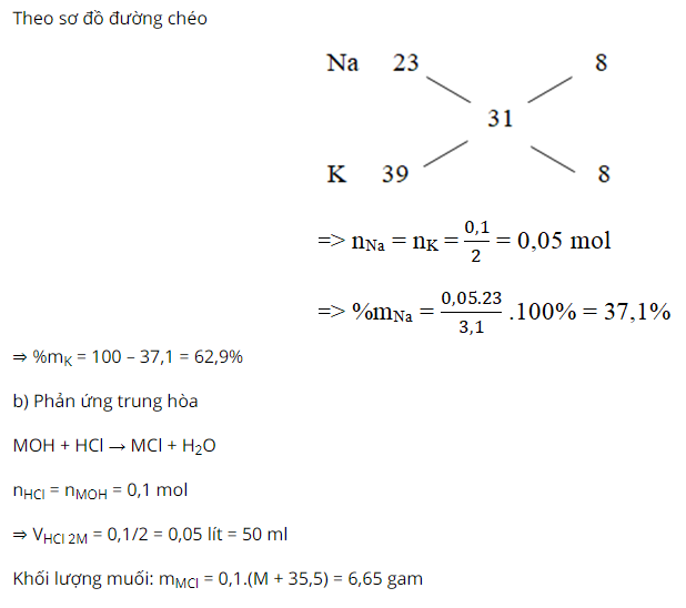 b) Tính thể tích dung dịch \(HCl\; 2M\) cần dùng để trung hòa dung dịch kiềm trên và khối lượng hỗn hợp muối clorua thu được.