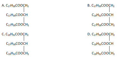 Khi thủy phân (xúc tác axit) một este thu được glixerol và hỗn hợp axit stearic (C17H35COOH) và axit panmitic (C15H31COOH) theo tỉ lệ 2 : 1.
