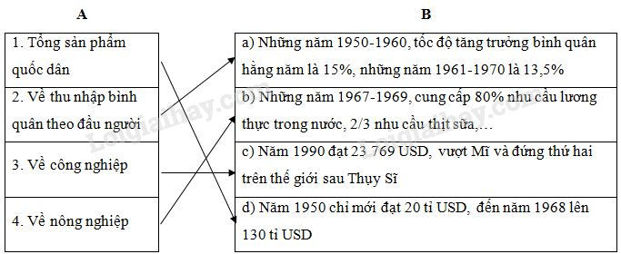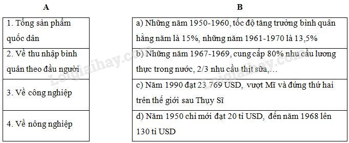 Giải bài tập 3 trang 33 sách bài tập Lịch sử 9. Hãy nối nội dung ở cột A với cột B cho phù hợp về sự phát triển của nền kinh tế Nhật Bản