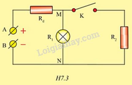 Mạch điện có sơ đồ như hình H7.3, hiệu điện thế giữa hai đầu A, B của mạch điện có giá trị không đổi U = 220V. Dây nối từ A đến M và từ B đến N là dây đồng có điện trở suất \(\rho  = 1,{7.10^{ – 8}}\,\Omega .m\), tiết diện 0,34 mm2, chiều dài tổng cộng \(l = 400m\) được biểu diễn bằng điện trở Rd trên sơ đồ.