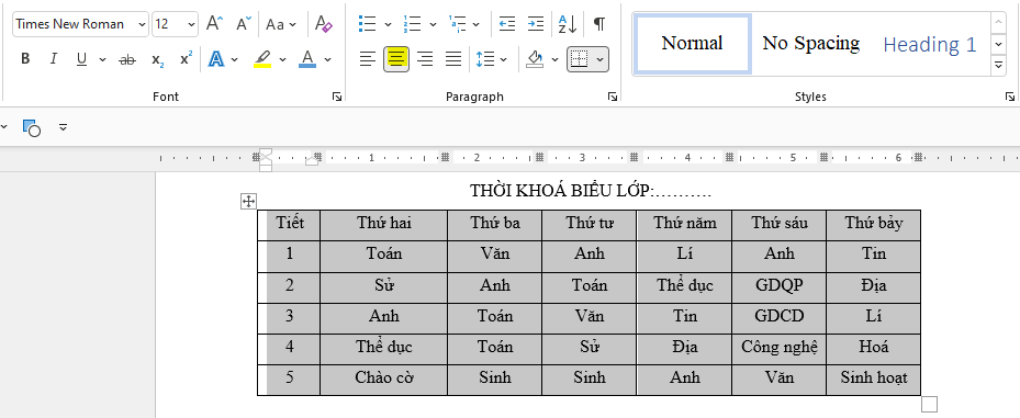 – Chèn bảng, xác định số hàng và cột (7 cột và 6 hàng) theo thời khoá biểu.