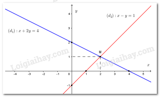 Trên hình 6 ta thấy \(\left( {{d_1}} \right)\) và \(\left( {{d_2}} \right)\) cắt nhau tại \(M\left( {2;1} \right)\)