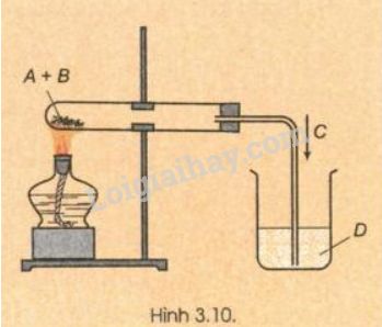 Hãy xác định công thức hoá học thích hợp của A, B, C, D trong thí nghiệm ở hình vẽ 3.10. Nêu hiện tượng thí nghiệm và viết phương trình hoá học.