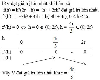 Ta có \(h^2(4r – 2h) = h.h.(4r – 2h)\)\( \le {\left( {{{h + h + 4r – 2h} \over 3}} \right)^3} = {\left( {{{4r} \over 3}} \right)^3}\)