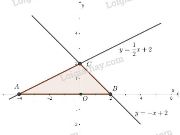 b) Gọi giao điểm của hai đường thẳng \(y = \dfrac{1}{2}x + 2\)  và  \(y = -x + 2\) với trục hoành theo thứ tự là \(A, B\) và gọi giao điểm của hai đường thẳng đó là \(C\). Tính các góc của tam giác \(ABC\) (làm tròn đến độ).