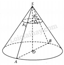 \(\eqalign{  & V ^*  = {V_1} – {V_2} \cr&= {1 \over 3}\pi .O{B^2}.SO – {1 \over 3}\pi .{O_1}{B_1}^2.S{O_1}  \cr  &  = {1 \over 3}\pi ({R^2}.2R – {{{R^2}} \over 9}.{{2R} \over 3}) = {{52\pi {R^3}} \over {81}}. \cr} \)