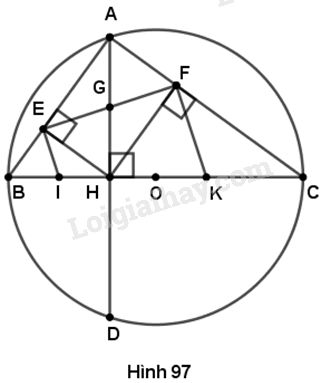 Gọi \(G\) là giao điểm của \(AH\) và \(EF,\) ta có \(AEHF\) là hình chữ nhật (theo câu b), do đó \(GH = GA;GF = GE,\) mà \(AH = EF\) nên \(GH = GF,\) suy ra \(\widehat {GFH} = \widehat {GHF}{\rm{                  }}\left( 3 \right)\)