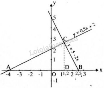 b) Gọi giao điểm của các đường thẳng y = 0,5x + 2 và y = 5 – 2x với trục hoành theo thứ tự là A, B và gọi giao điểm của hai đường thẳng đó là C.