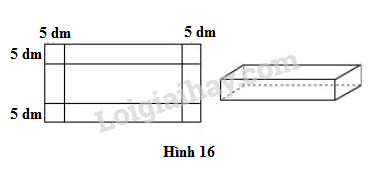 Từ một miếng tôn hình chữ nhật, người ta cắt ở bốn góc bốn hình vuông có cạnh bằng 5 dm để làm thành một cái thùng không nắp có dung tích 1500 dm3 (Hình 16). Hãy tính kích thước của miếng tôn, biết rằng chiều dài của nó gấp đôi chiều rộng.