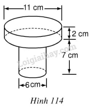 * Ta có: Thể tích phần cần tính là tổng thể tích của hai hình trụ có đường kính là \(11cm\), chiều cao là \(2cm\) và hình trụ có đường kính đáy là \(6cm\), chiều cao là \(7cm\):