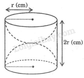 Một khối gỗ dạng một hình trụ đứng, bán kính đường tròn đáy là \(r (cm)\), chiều cao \(2r (cm)\), người ta khoét rỗng hai nửa hình cầu như hình 109.