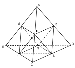 Vì các tứ diện AMPR, BMQS, CPSN, DQNR đều là những tứ diện đồng dạng với tứ diện ABCD với tỉ số \(k = {1 \over 2}\) nên ta có thể tích bằng \({V \over 8}.\)