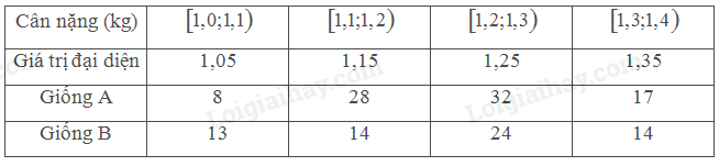 Nhóm chứa số trung vị của giống B là: \(\begin{array}{*{20}{l}}{\;\left[ {1,2;1,3} \right)}\end{array}\)