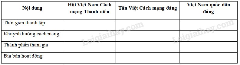 Giải bài 4 trang 63 sách bài tập Lịch sử 9. Bảng hệ thống về các tổ chức cách mạng ở Việt Nam trong những năm 20 của thế kỉ XX