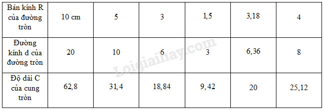 Lấy giá trị gần đúng của \(\pi \) bằng 3,14. Hãy điền vào ô trống (…) trong bảng sau (đơn vị độ dài: cm, làm tròn đến chữ số thập phân thứ nhất và đến độ):