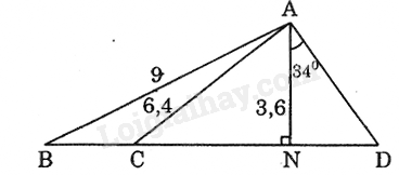 \(\sin \widehat {ABN} = \dfrac{{AN}}{{AB}} = \dfrac{{3,6}}{ 9} = 0,4\)