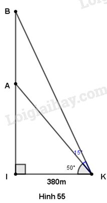 Trong tam giác vuông \(BIK,\) có \(\widehat K = {50^o} + {15^o} = {65^o}\) và \(IB = IK.\tan \widehat {IKB}\)\( = 380.\tan {65^o} \approx 815\left( m \right).\)