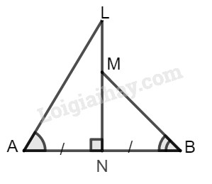 Đoạn thẳng \(LN\) vuông góc với đoạn thẳng \(AB\) tại trung điểm \(N\) của \(AB\); \(M\) là một điểm của đoạn thẳng \(LN\) và khác với \(L,N\). Hãy so sánh các góc \(\widehat {LAN}\) và \(\widehat {MBN}\).