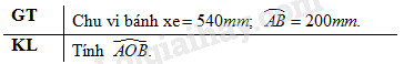 Giải bài 45 trang 118 VBT toán 9 tập 2. Bánh xe của một ròng rọc có chu vi 540 mm. Dây cu roa bao bánh xe theo cung AB có độ dài 200 mm. Tính góc AOB (h.56)…