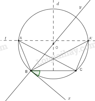 – Vẽ tia \(By \bot Bx\), tia \(By\) cắt đường thẳng \(d\) tại \(O.\) Vẽ cung \(BmC\) tâm \(O\) bán kính \(OB\) sao cho cung này nằm ở nửa mặt phẳng bờ \(BC\) không chứa \(Bx\). Cung \(BmC\) chính là cung chứa góc \(40^\circ \) cần dựng.