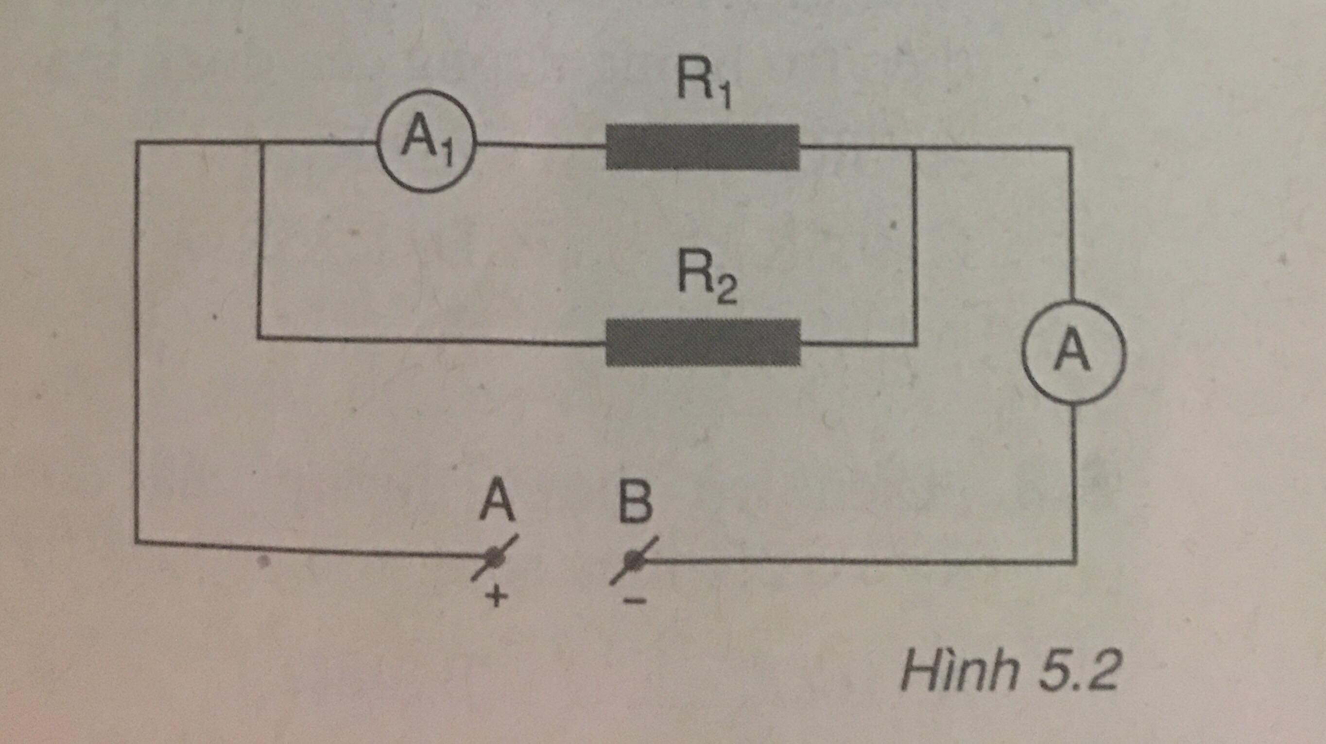Cho mạch điện có sơ đồ hình 5.2, trong đó R1=5Ω, R2=10Ω, ampe kế A1 chỉ 0,6A
