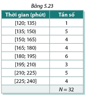 Bảng 5.23 biểu diễn kết quả thống kê về thời gian cần thiết để thực hiện cuộc chạy marathon đã được tổ chức ở một địa phương .
