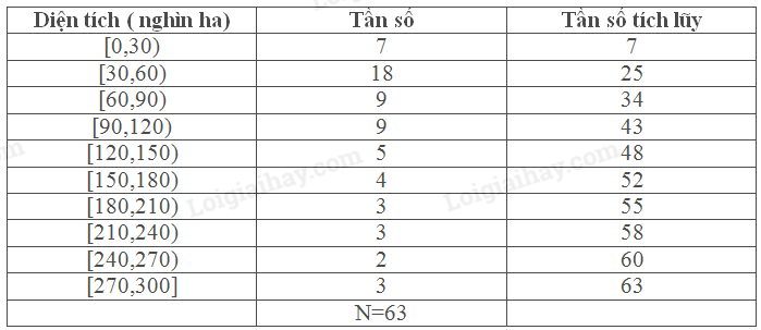 Có ít nhất 25 % số tỉnh có diện tích không vượt quá 45 nghìn ha. Cúng như vậy khoảng 50 % số tỉnh có diện tích  không vượt quá 82 nghìn ha, khoảng 75 % số tỉnh có diện tích không vượt quá 146 nghìn ha và khoảng 25% số tỉnh có diện tích từ 45 nghìn ha trở lên.