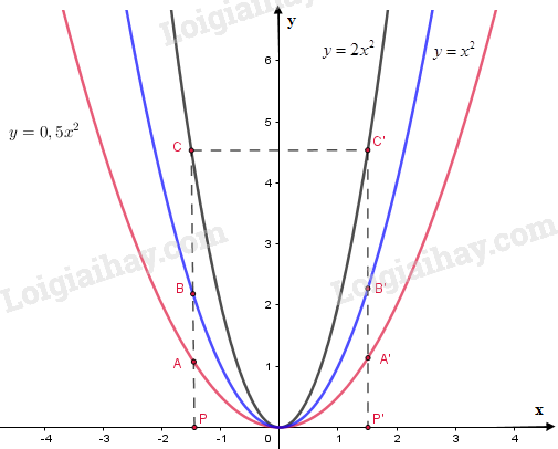 c) Xác định điểm \(P’\)  trên trục Ox có hoành độ \(x = 1,5\). Qua \(P’\)  kẻ đường thẳng song song với trục Oy, nó cắt các đồ thị \(y = \dfrac{1}{2}{x^2};y = {x^2};y = 2{x^2}\) lần lượt tại \(A’;B’;C’\)