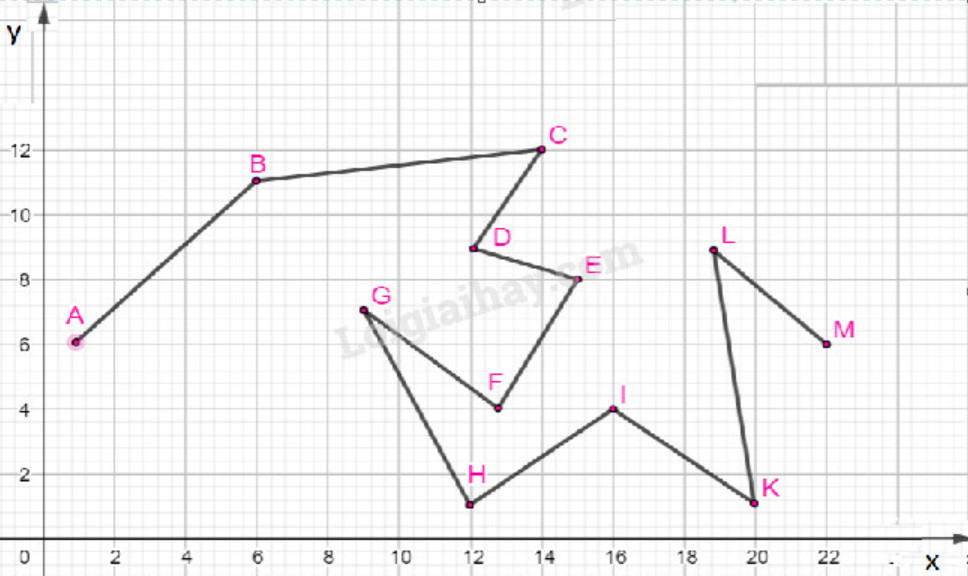 Dựng hệ trục tọa độ \(Oxy\), rồi dựng các điểm theo tọa độ của chúng, nối theo thứ tự các điểm , ta được một đường gấp khúc như hình dưới: