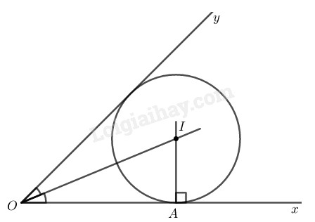 Vì \(I\) nằm trên tia phân giác của \(xOy\) nên \(I\) cách đều hai cạnh \(Ox, Oy.\) Khi đó khoảng cách từ \(I\) đến \(Oy\) bằng \(IA\) nên \(Oy\) cũng là tiếp tuyến của đường tròn \((I).\)