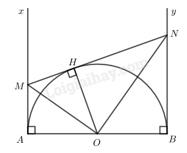 Cho nửa đường tròn tâm \(O\) đường kính \(AB.\) Gọi \(Ax, By\) là các tia vuông góc với \(AB\) \((Ax,By\) và nửa đường tròn thuộc cùng một nửa mặt phẳng bờ \(AB).\) Gọi \(M\) là điểm bất kì thuộc tia \(Ax.\) Qua \(M\) kẻ tiếp tuyến với nửa đường tròn, cắt \(By\) ở \(N.\)