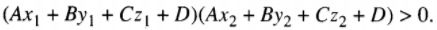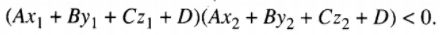 \(0 < {{A{x_2} + B{y_2} + C{z_2} + D} \over {A{x_1} + B{y_1} + C{z_1} + D}} < 1.\)