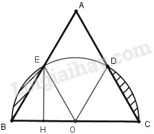 Tương tự, ta có \({S_2} = \dfrac{{{a^2}}}{{48}}\left( {2\pi  – 3\sqrt 3 } \right)\) vì \(OD = OE = DC = BE\) nên \(\Delta BOE = \Delta COD\) và \(\overparen{BE}=\overparen{CD}\).