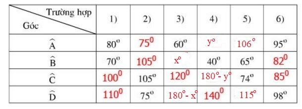 Vậy các góc còn lại là: \(\widehat{C}= 100^0,\) \(\widehat{D}  = 110^0.\)