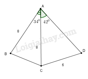 \(AB = AC = 8cm, CD = 6cm,\) \(\widehat {BAC} = 34^\circ \) và \(\widehat {CAD} = 42^\circ .\) Tính