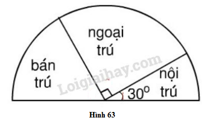 Biểu đồ hình quạt có tổng số đo ba góc ở tâm là \(180^\circ \) mà theo hình 63 ta có hình quạt biểu diễn học sinh ngoại trú có số đo góc ở tâm là \(90^\circ ,\) bán trú có số đo góc ở tâm là \(60^\circ \) và nội  trú có số đo góc ở tâm là \(30^\circ .\)