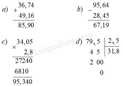 a) 36,74 + 49,16                                        b) 95,64 – 28,45