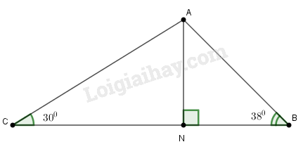 Trong tam giác \(ABC\) có \(AB = 11cm,\widehat {ABC} = 38^\circ ,\widehat {ACB} = 30^\circ \). \(N\) là chân đường vuông góc kẻ từ \(A\) đến \(BC\). Hãy tính \(AN, AC.\)