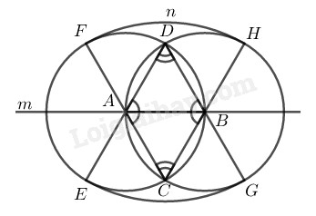 – Vẽ cung tròn tâm \(C\) bán kính \(6 cm\) cắt đường tròn \((A)\) và \((B)\) tại \(F\) và \(H\)