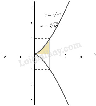 Thể tích cần tìm là: \(V = \pi \int\limits_0^1 {\left( {{1^2}-\root 3 \of {{y^4}} } \right)} dy \) \( = \pi \int\limits_0^1 {\left( {1 – {y^{\frac{4}{3}}}} \right)dy} \) \(= \left. {\pi \left( {y – {3 \over 7}{y^{{7 \over 3}}}} \right)} \right|_0^1 = {{4\pi } \over 7}.\)