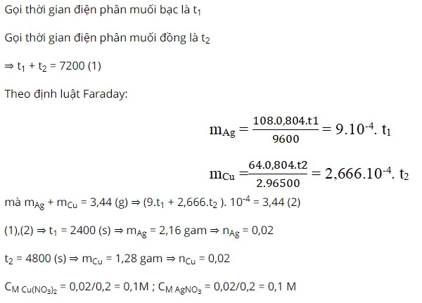 Điện phân \(200\;ml\) dung dịch có chứa 2 muối là \(Cu{(N{O_3})_2},AgN{O_3}\) với cường độ dòng điện là \(0,804\,A\) đến khi bọt khí bắt đầu thoát ra ở cực âm thì mất thời gian là \(2\) giờ, khi đó khối lượng cực âm tăng thêm \(3,44\) gam. Hãy xác định nồng độ mol của mỗi muối trong dung dịch ban đầu.