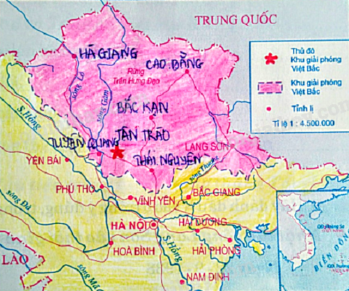 Quan sát hình 40 kết hợp nội dung SGK, em hãy làm rõ Khu Giải phóng Việt Bắc ở lược đồ bên bằng cách: Tô màu đỏ cho kí hiệu thủ đô và tô màu hồng cho địa bàn KGPVB. Ghi tên thủ đô, tên các tỉnh lị (lưu ý hoàn thành chú giải). Tô màu vàng nhạt cho phần ngoài Khu giải phóng Việt Bắc.