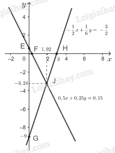 Đường thẳng \(0,5x + 0,25y = 0,15\) là đường thẳng đi qua hai điểm \(E,\ F\).