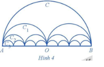 Gọi C là nửa đường tròn đường kính AB = 2R, C1 là đường gồm hai nửa đường tròn đường kính (frac{{AB}}{2},) C2 là đường gồm bốn nửa đường tròn đường kính (frac{{AB}}{4},…) Cn là đường gồm 2n nửa đường tròn đường kính (frac{{AB}}{{{2^n}}},…) (Hình 4). Gọi pn là độ dài của Cn, Sn là diện tích hình phẳng giới hạn bởi Cn và đoạn thẳng AB. a) Tính pn, Sn. b) Tìm giới hạn của các dãy số (pn) và (Sn).