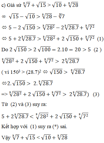 Vậy \(\root 3 \of 7  + \sqrt {15} \) < \(\sqrt {10}  + \root 3 \of {28} \)