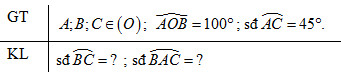 Giải bài 6 trang 89 VBT toán 9 tập 2. Trên đường tròn tâm O lấy ba điểm A, B, C sao cho góc AOB = 100 độ. Số đo cung AC bằng 45 độ. Tính số đo cung nhỏ BC và cung lớn BC …